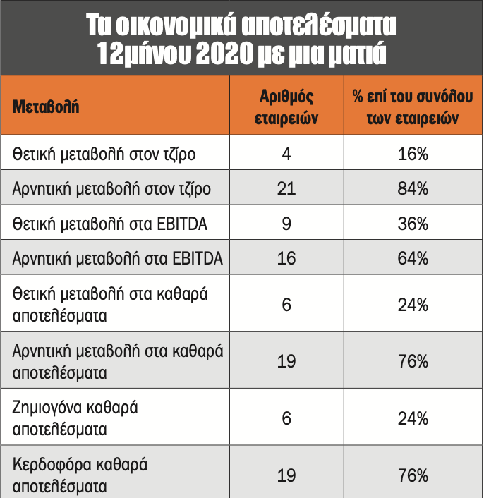 - Τη μεγαλύτερη ανθεκτικότητα στην κρίση παρουσίασαν οι εταιρείες (εκτός τραπεζών): Βιοχάλκο (+162%), ΔΕΗ (+102%), ΤΕΡΝΑ Ενεργειακή (+39%), ΟΤΕ (+6%),ΟΠΑΠ (+1%, λόγω εκτάκτων) και Σαράντης (+2%), καθώς ενίσχυσαν τα κέρδη τους παρά την πανδημία. Αντίθετα, τις μεγαλύτερες ζημίες σημείωσαν οι Aegean Airlines (-228 εκατ. ευρώ), Ελλάκτωρ (-187 εκατ. ευρώ) και Lamda Development (-52 εκατ. ευρώ).