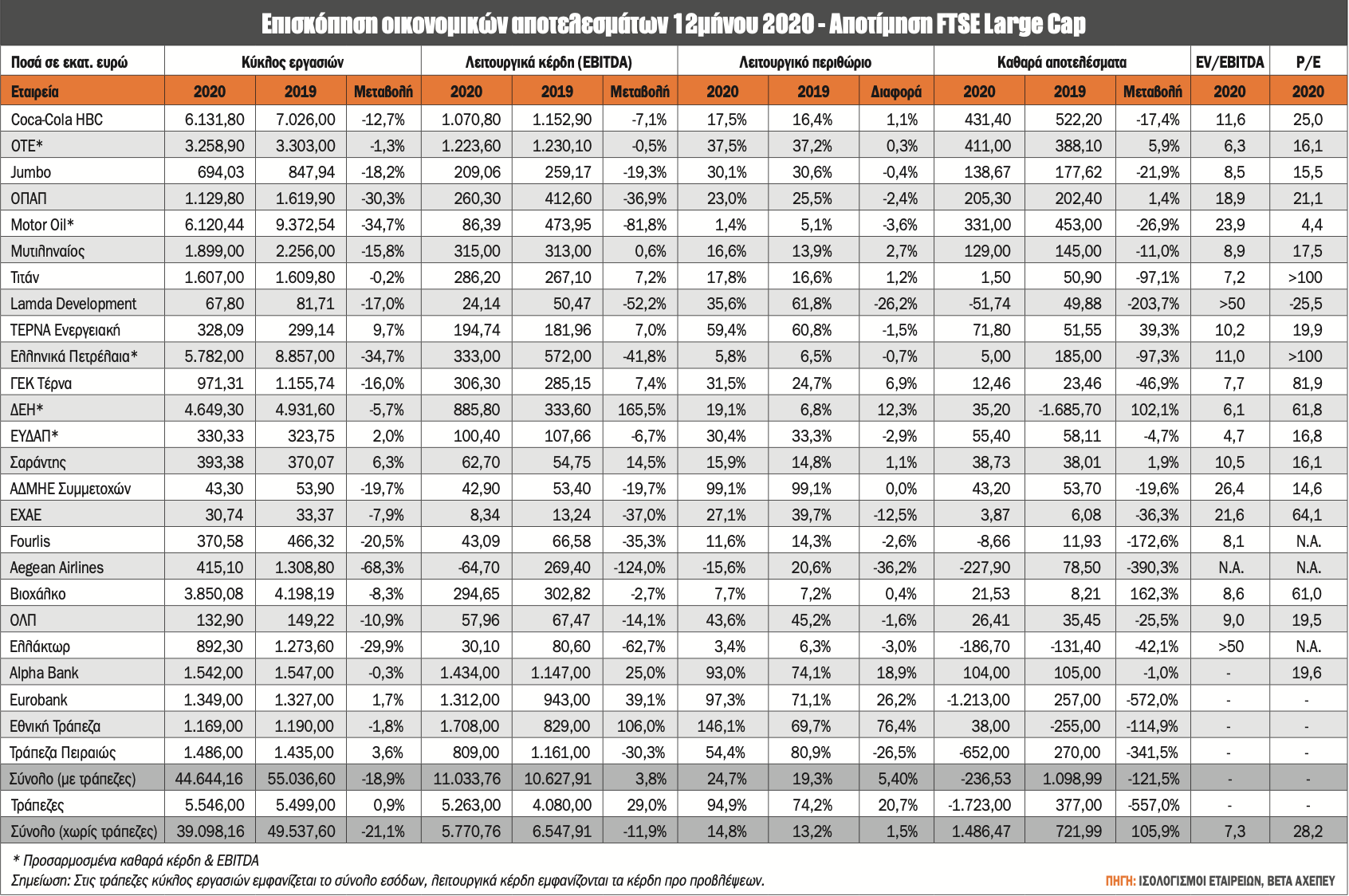 - Στην επισκόπηση των οικονομικών αποτελεσμάτων 2020 που ακολουθεί έχουν ληφθεί υπ’ όψιν τα επαναλαμβανόμενα μεγέθη για ΔΕΗ, ΟΤΕ, ΕΥΔΑΠ, ΜΟΗ και ΕΛΠΕ. Έτσι, δεν έχουν συμπεριληφθεί οι ζημίες των ΕΛΠΕ (-397 εκατ. ευρώ) και MΟΗ (-111 εκατ. ευρώ) που προέκυψαν από τα αποθέματα.