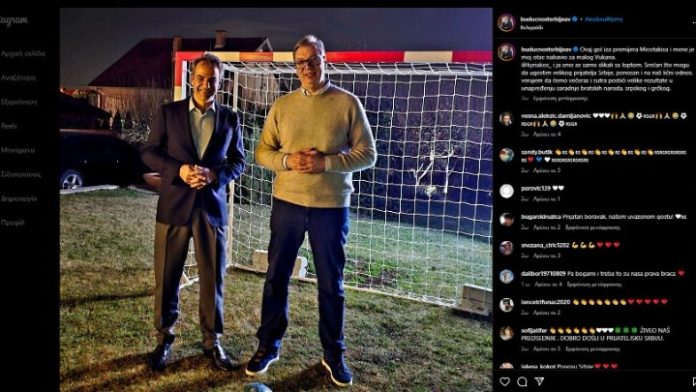 Ο Αλ. Βούτσιτς ανήρτησε στο Instagram φωτογραφία μαζί με τον Έλληνα πρωθυπουργό μπροστά από μία εστία ποδοσφαίρου όπου έγραψε: «Αυτήν την εστία πίσω από τον πρωθυπουργό Μητσοτάκη και εμένα την αγόρασε ο πατέρας μου για τον μικρό Βούκαν (σ.σ.: ο εξάχρονος γιος του Αλ. Βούτσιτς). Ο Κυριάκος και εγώ απλά βγήκαμε φωτογραφία με την μπάλα. Χαίρομαι που μπορώ να φιλοξενήσω έναν μεγάλο φίλο της Σερβίας, είμαι περήφανος για την προσωπική μας σχέση, πιστεύω ότι θα επιτύχουμε σπουδαία αποτελέσματα στη βελτίωση της συνεργασίας μεταξύ των αδελφών λαών, του σερβικού και του ελληνικού».