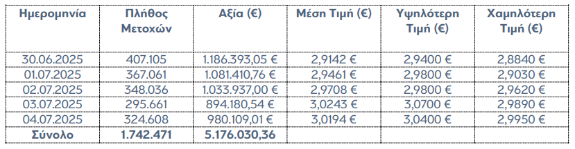 Η «Eurobank Ergasias Υπηρεσιών και Συμμετοχών Ανώνυμη Εταιρεία» («Eurobank Holdings»), σε συνέχεια της από 07.05.2025 ανακοίνωσής της σχετικά με την έναρξη εφαρμογής του Προγράμματος Επαναγοράς Ιδίων Μετοχών («Πρόγραμμα»), που εγκρίθηκε με την απόφαση της Τακτικής Γενικής Συνέλευσης των Μετόχων της Eurobank Holdings στις 30.04.2025 και σε συνέχεια της από 30.04.2025 απόφασης του Διοικητικού Συμβουλίου της, ενημερώνει το κοινό ότι κατά το διάστημα 30/06/2025 – 04/07/2025 απέκτησε συνολικά, στο πλαίσιο του Προγράμματος, 1.742.471 μετοχές εκδόσεως της ιδίας («Ίδιες Μετοχές») που διαπραγματεύονται στο Χρηματιστήριο Αθηνών («Χ.Α.»), με μέση τιμή κτήσης €2,9705, ανά μετοχή και συνολικό κόστος €5.176.030,36.