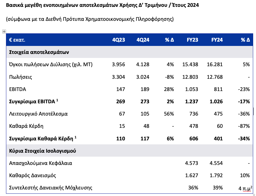 Αναφορικά με τα Δημοσιευμένα αποτελέσματα, οι ζημιές αποτίμησης αποθεμάτων (€128 εκατ.), εξαιτίας της μείωσης των τιμών πετρελαίου και προϊόντων, οδήγησαν τα αντίστοιχα Κέρδη EBITDA στα €811 εκατ., ενώ τα Δημοσιευμένα Καθαρά Κέρδη διαμορφώθηκαν στα €60 εκατ., λόγω της Προσωρινής Συνεισφοράς Αλληλεγγύης (€173,5 εκατ. μετά φόρων) που επιβλήθηκε κατά τη διάρκεια του 2024, με βάση τα φορολογικά κέρδη του 2023.