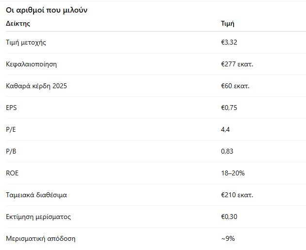 Με βάση αυτά τα δεδομένα, τα κέρδη ανά μετοχή διαμορφώνονται κοντά στα 0,75 ευρώ, με δείκτη P/E 4,4, επίπεδο που υποδηλώνει σημαντική υποτίμηση σε σχέση με τα μεγέθη και τη δομή του ισολογισμού.