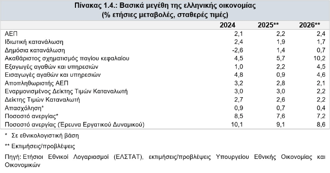 Η προβλεπόμενη αύξηση του πραγματικού ΑΕΠ για το 2026 εκτιμάται στο 2,4% σε ετήσια βάση, σημειώνοντας επιτάχυνση σε σχέση με τα τρία προηγούμενα έτη (2,1% το 2023 και το 2024 και 2,2% το 2025). Με αυτόν τον ρυθμό, το 2026 θα αποτελέσει το έκτο συνεχόμενο έτος με ανάπτυξη πάνω από 2%.