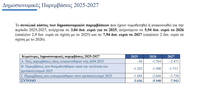 Το συνολικό κόστος των δημοσιονομικών παρεμβάσεων που έχουν νομοθετηθεί ή ανακοινωθεί για την περίοδο 2025 – 2027, όπως αποτυπώνεται και στον ακόλουθο πίνακα, ανέρχεται σε 3,04 δισ. ευρώ για το 2025, αυξανόμενο σε 5,94 δισ. ευρώ το 2026 (επιπλέον 2,9 δισ. ευρώ σε σχέση με το 2025) και σε 7,94 δισ. ευρώ το 2027 (επιπλέον 2 δισ. ευρώ σε σχέση με το 2026).