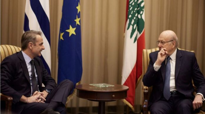 Ο πρωθυπουργός του Λιβάνου Νατζίμπ Μικάτι υποδέχθηκε νωρίτερα σήμερα Δευτέρα στο αεροδρόμιο της Βηρυτού τον Κυριάκο Μητσοτάκη, ο οποίος επισκέπτεται τη χώρα.