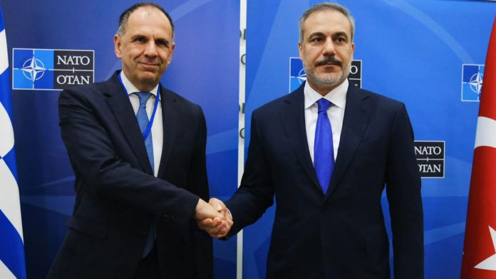 Με τον Τούρκο υπουργό Εξωτερικών Χακάν Φιντάν συναντήθηκε νωρίτερα σήμερα Τετάρτη ο υπουργός Εξωτερικών Γιώργος Γεραπετρίτης, στο περιθώριο της συνόδου των υπουργών Εξωτερικών του ΝΑΤΟ στις Βρυξέλλες.